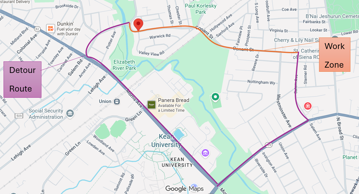Due to the nature of the project, Trenton Ave from 5th Ave to Clifton St will be fully closed to vehicles and pedestrians, access will be provided to City of Elizabeth Animal Shelter and Recycling Center. The work is scheduled to be completed on or about March 2026 contingent on utility work.